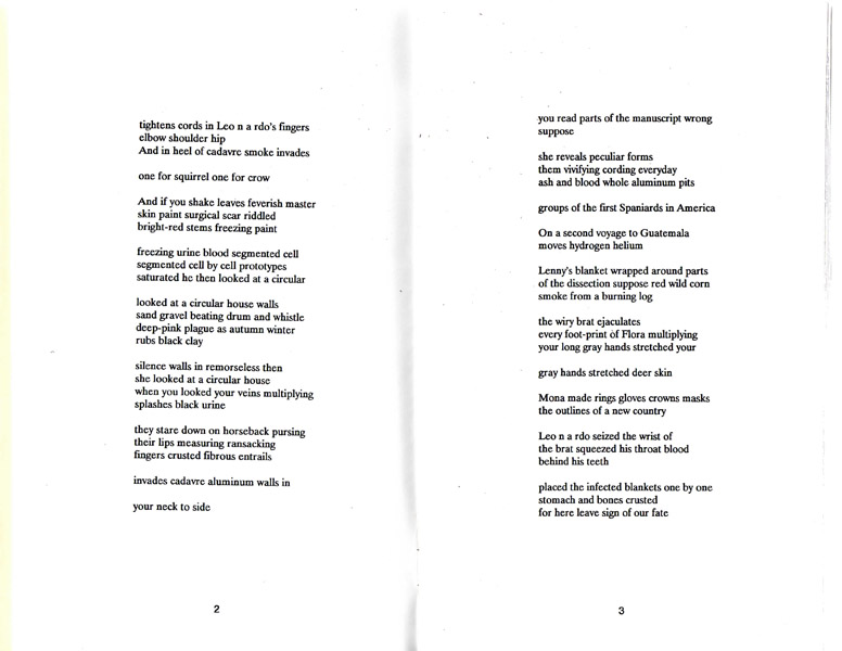 Words remind the body. They plunge, excrete, “And if you shake leaves feverish master/skin paint/surgical scar riddled/bright-red stems freezing paint//freezing urine blood segmented cell/segmented cell by cell prototypes/saturated he then looked at a circular//looked at a circular house…” and define by omission a rhythm which is the body’s: The unbroken flow of consciousness broken by the unitary juxtaposition of the elements of the unspoken sentence which departs from within to celebrate the force which puts them together, in the blood’s body beating from the heart, no simple systole/diastole, but the light from within by which “fingers crusted fibrous entrails” the continuous is divided, “dark ridge of lava to north parched/halves of skulls placed one by one” as the earth’s own myth regenerated in blood sacrifice, a theater of cruelty divined by the one who sees.