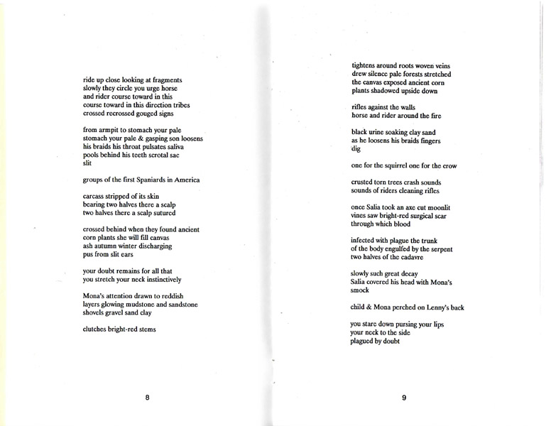 This is the new. “every inch lacterous mistrusts” but why? If it’s narrative, is it poetry or what? Why is it poetry? It invades a space, my own, wherein “circles widening faint until her body/until her body hung wounded and bloody/gouged walls crust soaking/you light a match calculate weight of carcass” has discontinuous present, implied syntax, spaces moving behind the perception of them. “her saliva pools behind her teeth” a phrase at the start and again at the end. There is no continuous movement from beginning to middle to end, no it is mandala-presentation of deepening image drawn from the inside, too close you might think, like the by-now well-documented man from one world who stands too close to the man from another, and as one moves in the other moves back, each of them trying to feel “comfortable”, this is what is happening here, and the words hung on the screen of the page document a texture behind which this crucifiction takes place, “her body hung wounded and bloody,” the crucifiction of an Indian woman by the Spanish some time in the past of the mind which is yet the present of her language, “red stems protruding from black clay/burns in the wood.”