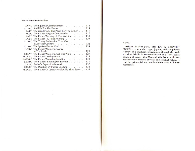 Taking her title from this graffiti-artist’s crude creative effort, Rochelle Owens has re-written the established myths of our origins—how the world got to be the way it is-in an 82-section Avant-garde Testament, beyond Old and New. Joe’s single signature blossomed into colossi- murals, star-studded and spraygun-executed, taking a whole furtive night in the roundhouse to complete, loud telegrams to all subway riders that nothing, including subway cars, is as it was in the beginning, but is overlaid with imagination and invention, accidents and caprice, multiple allusions—all filters through which facts take on meaning. Everyman/woman (Joe) his/her own Creator is re-creating the world because the old myths no longer explain enough of our experience. At the same time it has been forgotten that those myths are not absolutes of reality but constructs of words, venerable but not necessarily true.