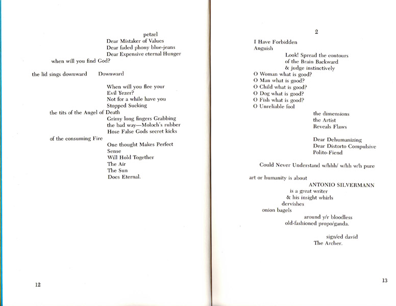 As an introduction to Shemuel, Rochelle Owens states that: “Imagination is the generator of the word as act/event. In Shemuel the journey begun in The Joe 82 Creation Poems and The Joe Chronicles, Part 2, continues to explore through patterns of force the conjunction of the old and the new, the spiritual and the physical.” Over the years, Owens is slowly developing a major work in several volumes, of the nature and scope of Ezra Pound’s Cantos, Charles Olson’s Maximus Poems or Diane DiPrima’s Loba, but from a very Jewish (Hebraic) viewpoint.