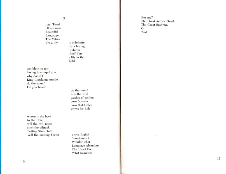 From various poems, we are given to understand that king lugalannemundu, the major character in The Joe Chronicles, is: a Christian boy or prince from Guyana (born for the joys of this world and who loves carp and red beets) who is courting various women (including a blond, a Greek, a housewife from a supermarket). Both the women and the poems are meant to transform him (and at the same time themselves and each other). The poem is the breath in his throat. More importantly, this is a man any man, in search for himself. Phonetic (mock-ancient) spellings and line breaks in the middle of words seem arbitrary and add to the confusion, but the voice transcends them.